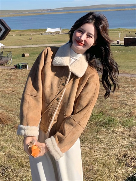 Áo khoác da lộn cúc bấm túi chéo K055