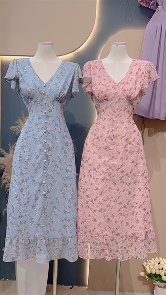 2276 đầm hoa nổi 2 lá cổ sóng thêu BUỘC NƠ EO