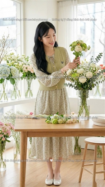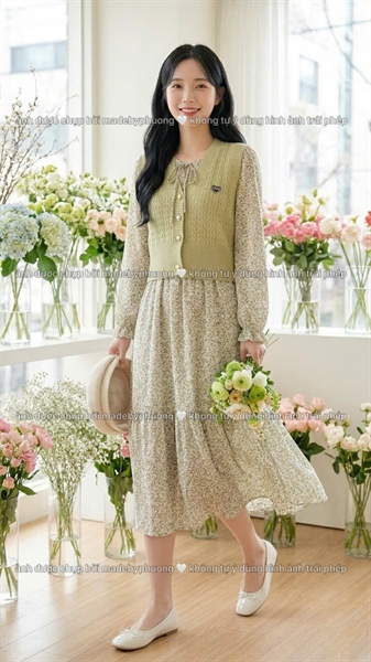 Set đầm hoa lụa cát vintage + Gile len tag tim gam màu Xanh ánh vàng